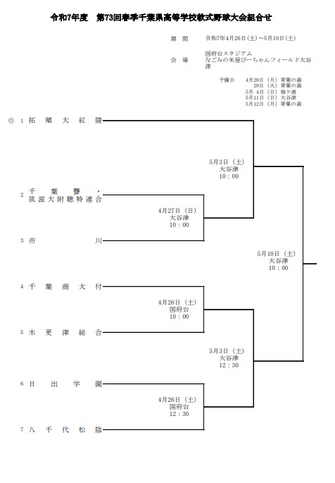 9月3日、千葉県高等学校野球連盟事務局にて第66回秋季千葉県高等学校軟式野球大会組み合わせ抽選が行われ、本校は10月4日(土)にゼットエーボールパークにて八千代松陰高校と千葉商大付属高校の勝者と対戦する事となりました。 左のサムネイル画像をクリックして下さい。組合せ(PDF)がご覧になれます。